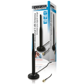 KÖNIG WIFI OMNIDIRECTIONELE ANTENNE 5 DBI Versterk het draadloze signaal van je modem, router of WLAN kaart met 5 dBi met deze omni-directionele antenne. De antenne maakt gebruik van de 2.4 GHz frequentie en hoeft niet in de richting van het ontvangende