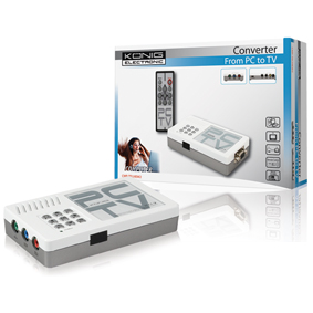 KÖNIG PC NAAR TV CONVERTER Deze converter zorgt voor omvorming van computer videobeelden naar hoogwaardige videobeelden geschikt voor televisie. De converter ondersteunt resoluties tot 1600 x 1200* 60 Hz. Ideaal als je computerspellen wilt spelen op de TV, of online uitzendingen op je TV wilt bekijken. Ook handig: hij is klein dus gemakkelijk om mee te nemen. Voeding via de USB port.
