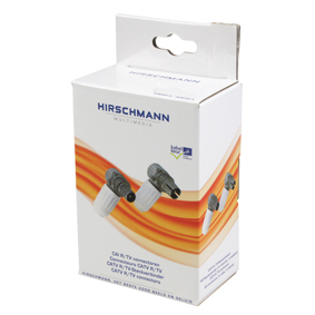 HIRSCHMANN IEC CONNECTOREN (M/F) Set hoogfrequent dichte (85 dB) haakse (IEC) coax stekers met een zeer goede trekontlasting.