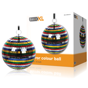 BasicXL KLEUREN SPIEGELBOL Spiegelbol met gekleurde spiegels en een dwarsdoorsnede van 20 cm. De spiegeltjes zijn van echt glas (10x10 mm). Creëer een leuk effect met een par spot of een laser.